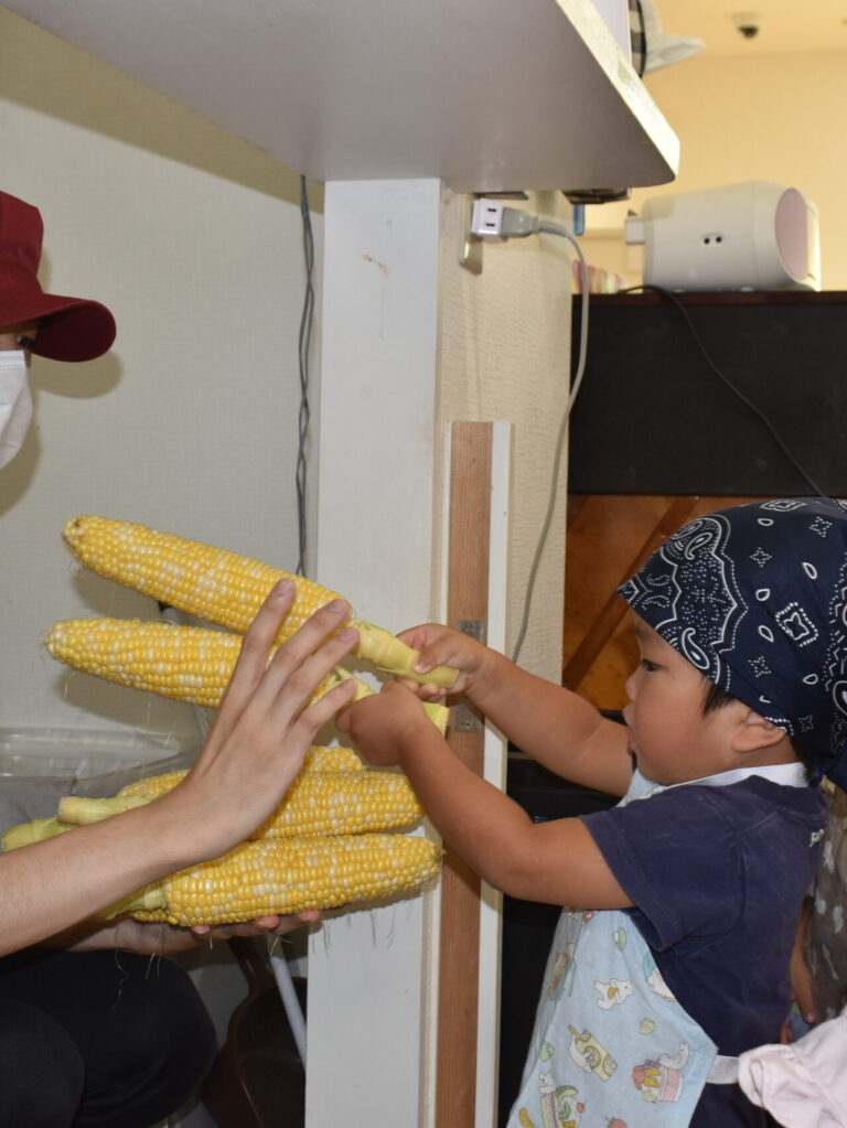 夏の味覚!とうもろこしの皮むきと枝豆の鞘取りの食育を行いました。 エプロンや三角巾を付けてやる気満々の子どもたち🔥😮 小さな手で一生懸命皮をむいたり鞘を取っていました👏 給…