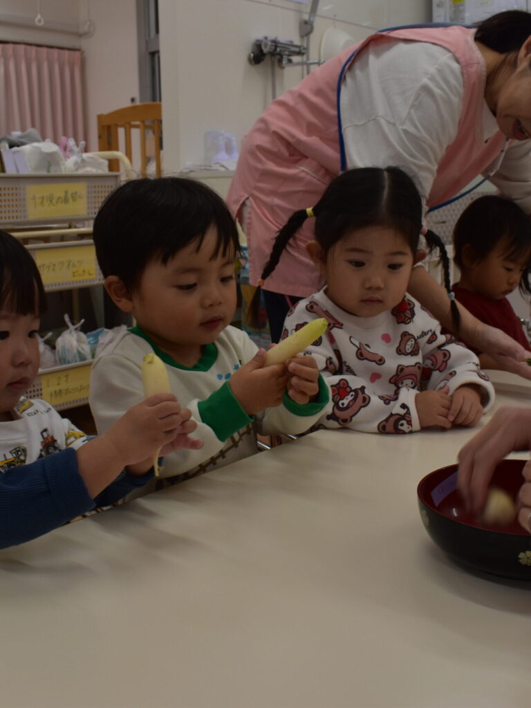 味覚の育つ大事な時期に旬の素材を生かした手作りの給食を皆でおいしくいただく。