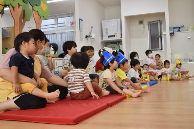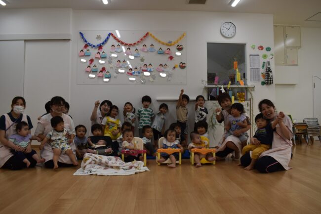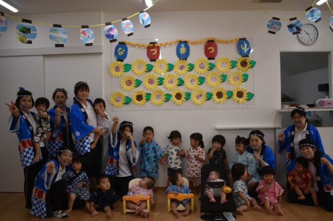今日は夏祭りでした☆ 初めての夏祭りに子ども達も期待いっぱいの様子でした。 最初は2グループに分かれてゲームをしました。 2歳児のお友達はルールを守って自分たちで楽しみ、 0、1歳児のお友達は先生と一緒に参加して輪投げや…