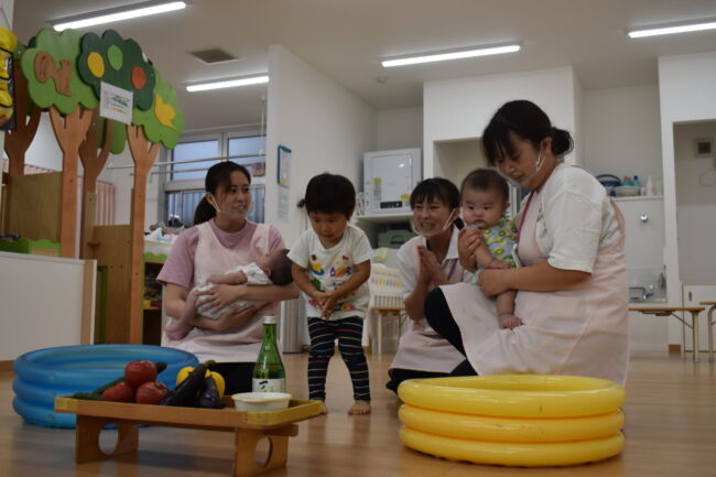 7月から始まる水遊びの前に、プール開きを行いました。 お供え物を用意して、お酒とお塩でお清めをしました。 けがや事故なく、安全に水遊びを楽しめるようお祈りをします。 晴れた日は水遊びをして、夏ならではの遊びを楽しみたいと…