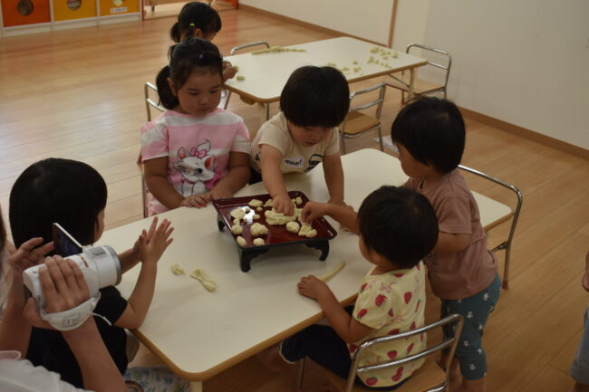 十五夜の日にお月見会を行いました。 ペープサートでお月見についてのお話を聞きました。 手で満月を作りながら「お月見の歌」をみんなで歌いました♪ そのあとは、小麦粉粘土でお月見団子を作ります! 先生と一緒にちぎったり丸めた…