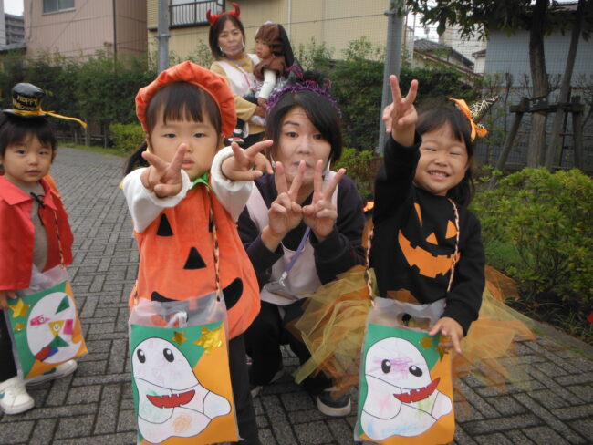 ハロウィンパーティーでは、大人も子どももみんなで仮装をして公園までおかしをもらいに行きました。 好きなキャラクターやかぼちゃのおばけの衣装などみんなのかわいい仮装に、近所の方たちから「かわいいね~」とたくさん声をかけても…