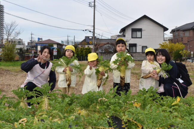 2歳児クラスのシマウマ組さんと大根掘りへ行きました♪ 前日からこの日を楽しみにしていた子どもたち。 ぱりぽりくんバスに乗って畑まで行ったのですが、バスを待っている間もうれしそうな表情をしていました(^^♪ 畑には大きな大…